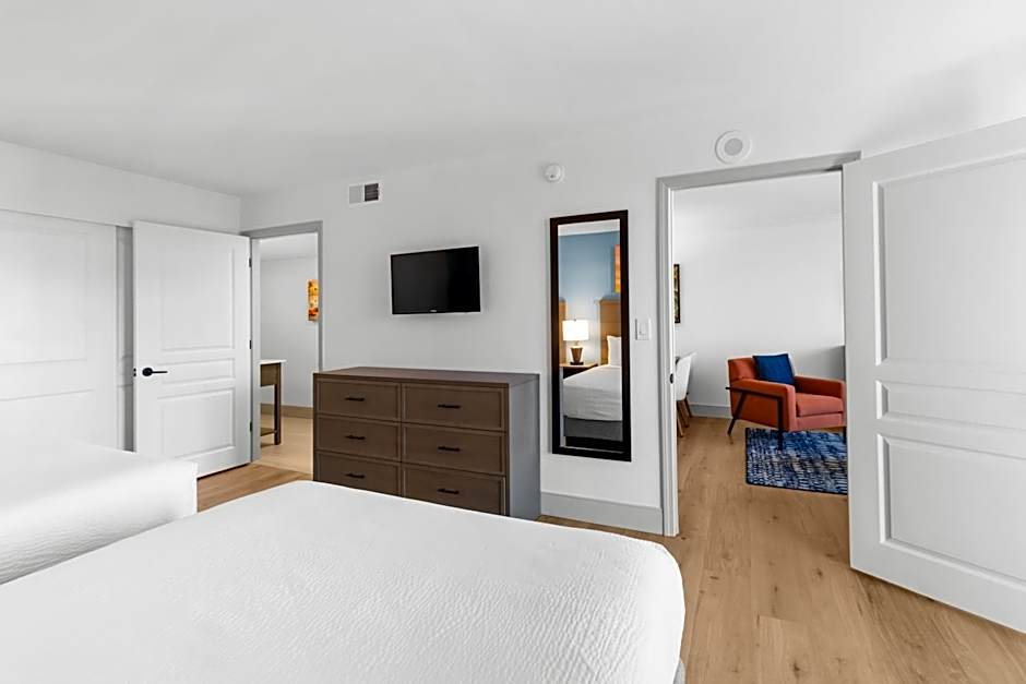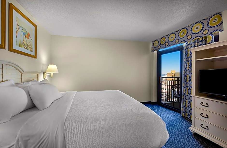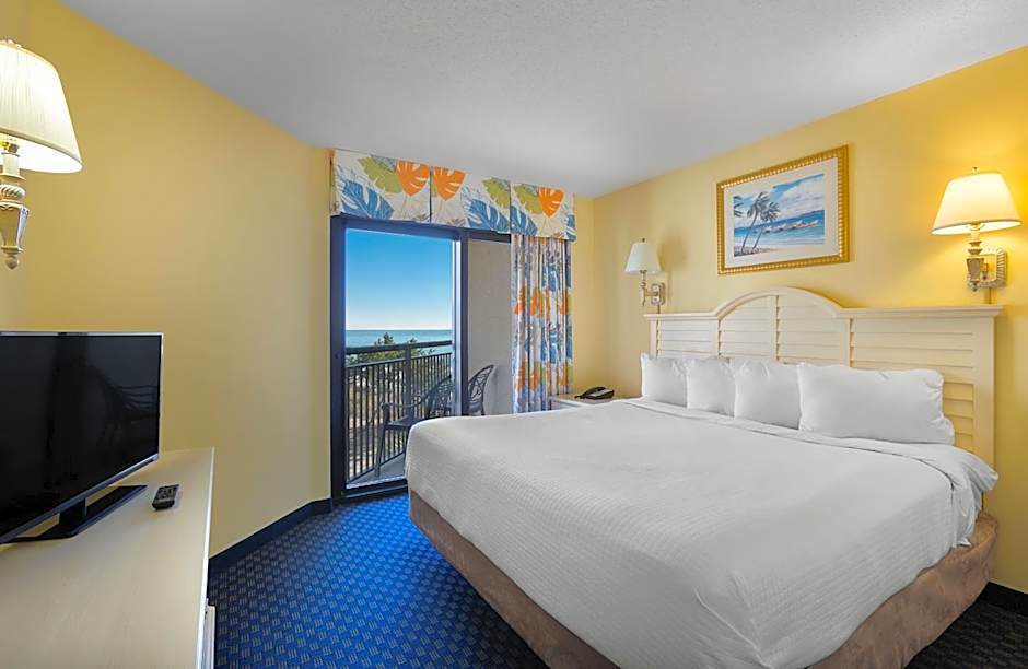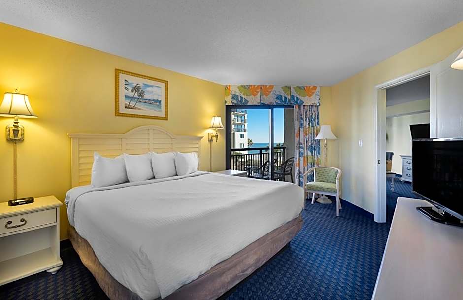 Offering an ocean view, this king suite also includes a seating area with a sofa, a balcony, and a kitchen area with a stove and oven.